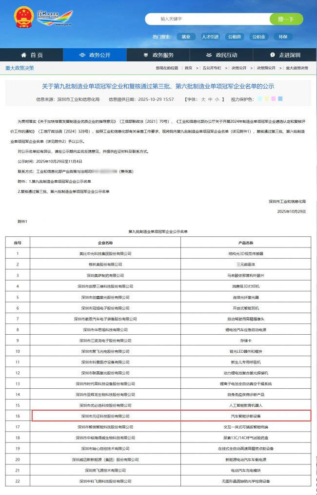 近日,深圳市工业和信息化局按照国家工业和信息化部有关审查工作要求,公示了第九批制造业单项冠军企业名单,深圳市元征科技股份有限公司凭借其“汽车智能诊断设备”荣耀登榜。这不仅是对元征科技三十多年专注与创新的高度肯定,也标志着中国在汽车智能诊断这一关键细分领域,拥有了具备全球市场竞争力的领军企业。