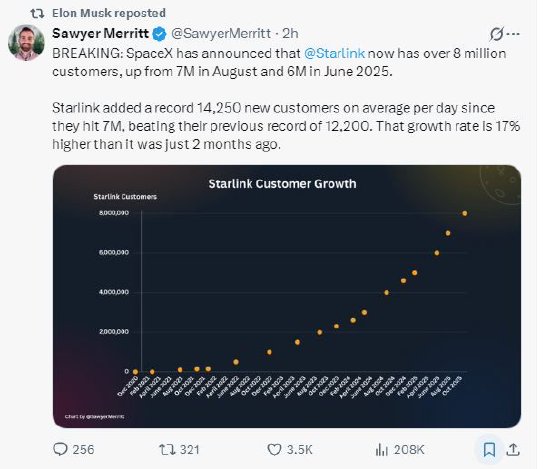 根据马斯克转发的电动汽车分析师索耶·梅瑞特的帖子,自达到700万用户以来,星链平均每天增加14250个新用户,这一增长率比两个月前高出17%。