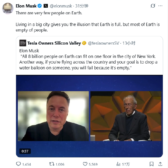 马斯克回应称:“地球上的人口实际上非常少。生活在大城市里会让你产生一种错觉,以为地球已经人满为患了,但实际上地球的大部分地区并没有多少人居住。”