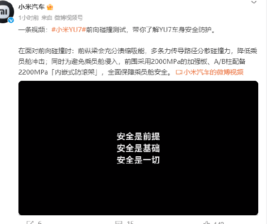 11月14日消息,小米汽车官方微博发布#小米YU7#前向碰撞测试视频。